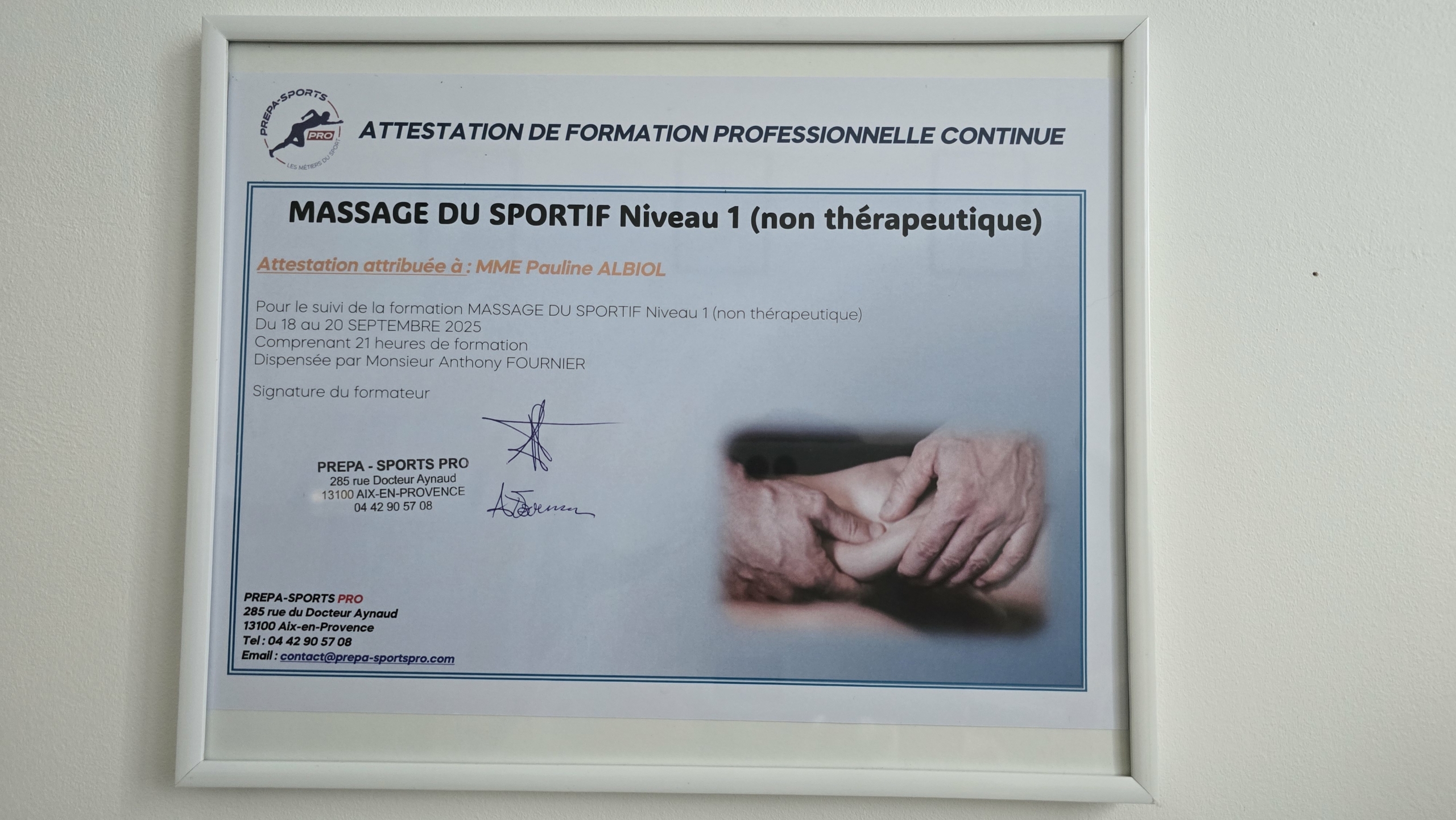 Amoureuse de course à pied et de longue distance, je me suis formée en 2025 au massage pour les sportifs chez Prépa-SPORT. C’est avec joie que je vous accompagnerai durant vos phases de préparation et de récupération au cabinet ou pourquoi pas sur différents stands de course à pieds dans le secteur !
